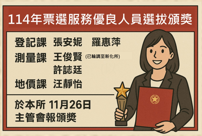 投票時間:114年9月1日 至 9月30日投票方式:現場票選(各樓層設有投票單及投票箱)票選方式:每人每張選票最多可填寫2名服務人員,無記名投票。投票對象:前來洽公民眾及地政相關業務辦理者